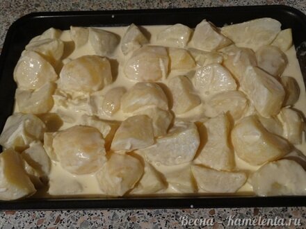 Картофель заранее отварите, нарежьте на крупные кубики или дольки. Соедините картофель и сметану. Хорошо перемешайте и выложите в форму.