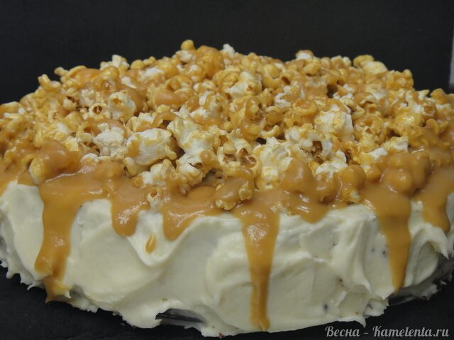 Теперь собираем наш торт. Обмазать коржи охлаждённым кремом. Оформить на Ваше усмотрение. Я использовала карамельный попкорн и солёную карамель. Поставить торт в холодильник на 1-2 часа.