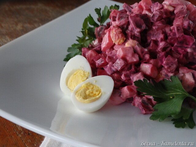 Свёклу можно отварить, а лучше запечь её в фольге в духовке. Так она сохранит свой цвет Нарезать свёклу мелким кубиком.