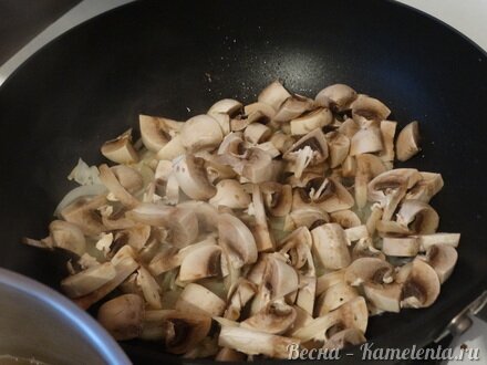Добавить грибы к репчатому луку. Продолжаем обжаривать.