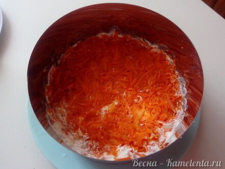 На морковь укладываем натёртые яблоки (можно яблоки очистить от кожуры ), присолить и смазываем заправкой.