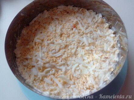 Затем укладываем слой натёртых яиц. Ещё немного смазываем заправкой.