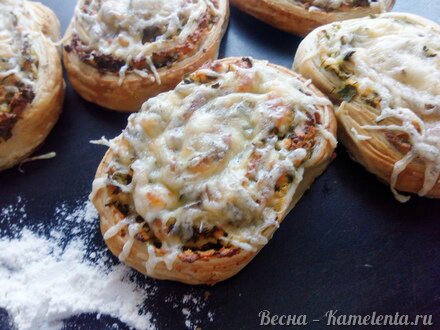 За пять минут до готовности слоек, присыпать слойки тёртым сыром. И ставим ещё раз в духовку, чтобы образовалась сырная корочка.