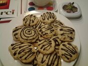 Готовые печенья у украсила сеточкой из растопленного белого шоколада (положив шоколад в уголок целлофанового пакетика, опустив его в кипяток, срезав 1 мм кончика пакета). Можно просто посыпать их сахарной пудрой или оставить как есть.