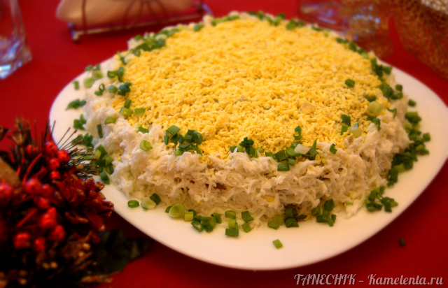 Люблю рецепты, которые можно готовить за день до застолья. Этот торт я обычно готовлю с вечера, только не украшаю, убираю в холодильник, а, незадолго до подачи, посыпаю тертым яйцом и зеленью.