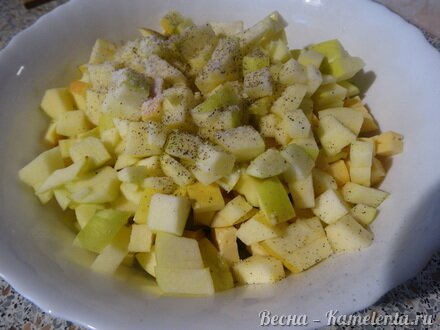 Яблоки нарезать кубиком. Посолить и поперчить.