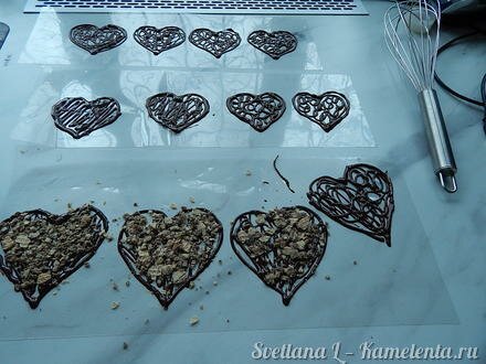 А также можно использовать силиконовый коврик, но тогда придется сердечки рисовать сразу самим шоколадом.